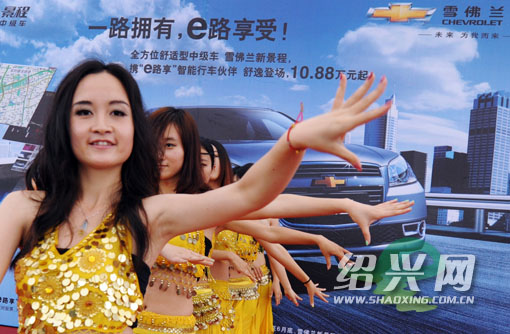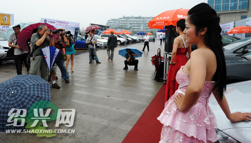 本网讯 为期三天的2011嵊州车展6月4日在雨中开展,本次车展由嵊州市商务局等单位主办,在该市体育馆内的展区内奔驰、宝马、奥迪等45家品牌子厂商参展,主办方还请来车模助阵演出,让许多车迷和市民在二天的细雨中,品味雨中车展的别样韵味。