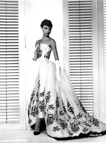 在《龙凤配》中奥黛丽扮演的人物是萨布丽娜,异常美丽。片中赫本身穿的那件优雅大花长裙更是纪梵希的经典之作。一层蝉翼纱从腰身直泻而下,上衣、裙身以及裙摆都刺绣着十八世纪风格的花卉图饰,曳地部分的裙摆构成了椭圆图形,镶边用黑色蝉翼纱褶饰,丝质的衬里,腰部使用勾眼扣紧,由其赫本美丽纯洁的气质在这款晚装的衬托下,显得愈发超凡脱俗,令所有在场的女人黯然失色。这款晚装也随之成为好莱坞历史上最重要的戏服之一。
