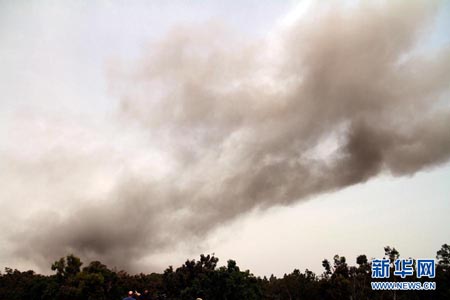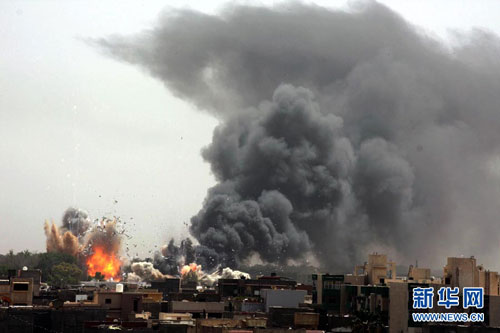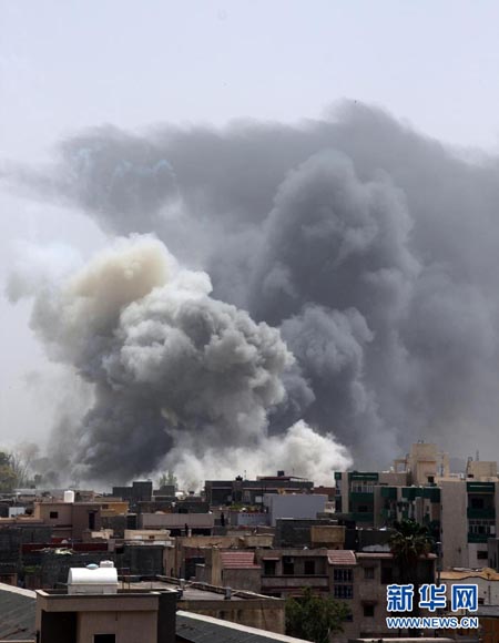 这是6月7日在利比亚首都的黎波里拍摄的剧烈爆炸后升起的浓烟。利比亚首都的黎波里等地目标近日受到北约战机的持续轰炸。 新华社发