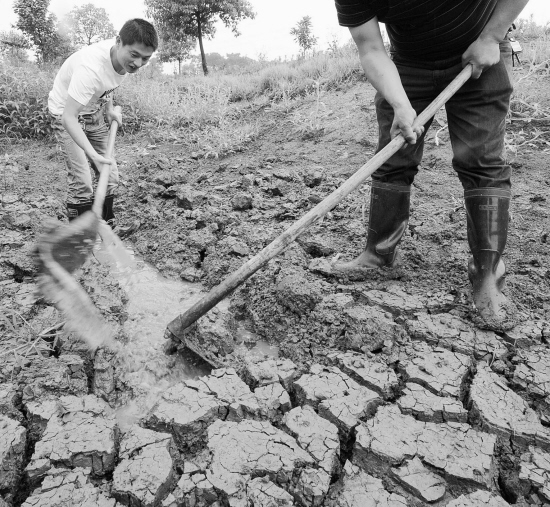 连日来,嵊州市全境降雨,虽然大水库喝了个饱,可由于严重缺水而出现龟裂的山塘依然缺水严重。该市各地的村民连忙开沟挖渠,引水入塘入田,让已经干裂的田地喝个饱。这是该市剡湖街道沙园村的村民正在山塘里开挖引水沟。 (记者 张亮宗 摄)