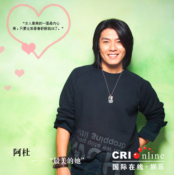 长发、羞涩的大男人是阿杜留给大家的印象,这位“平民天王”在谈到自己心中最美的她时表示:“女人最美的一面是内心美,只要让我看着舒服就OK了。”与相恋多年的女友分手后的阿杜,言谈中无时不透露着对新女友的渴望。