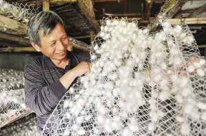 据了解,今年绍兴市共计发放春蚕种24990余张,据估算,春蚕产值将达到5000万元,主要养蚕县(市)嵊州市春蚕蚕种发放量达9300张,通过生态养殖,产值可达2000万元。而去年该市春蚕总产值为1243万元,增幅将高达六成,为历年之最。6月1日,浙江省经作局和蚕种公司负责人在嵊州市指导生态养殖春蚕技术,为春蚕蚕茧收购把关。图为嵊州市三界镇养蚕大户吴石炯在蚕室里向记者展示雪白的蚕茧。 (记者 张亮宗 通讯员 章祝平 摄)