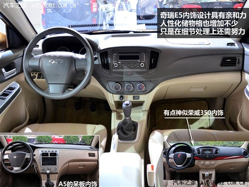 内饰部分,奇瑞E5进行了彻底的重新开发,中控台造型与旗云3发生了本质的不同。空调出风口的位置、空调旋钮、挡把、车门把手、水杯架等部位都发生了改变。而内置的20多处储物空间,使得E5在空间上进步明显。