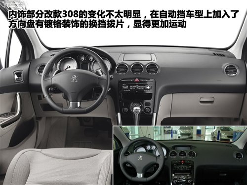 内饰部分,海外改款308的内饰部分变化不太明显,而在自动挡车型上还加入了方向盘换挡拨片并加入了镀铬装饰。此外,据官方表示,新车的座椅在材质和制作工艺方面也进行了升级,使得新座椅更加舒适,造型也有细微变化。