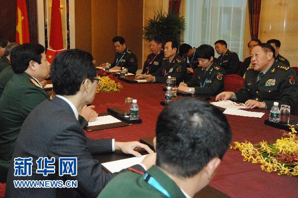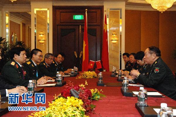 6月3日,中国国务委员兼国防部长梁光烈(右一)与越南国防部长冯光青(左一)在新加坡举办的香格里拉对话会间隙举行双边会见。新华社发(邓智炜摄)