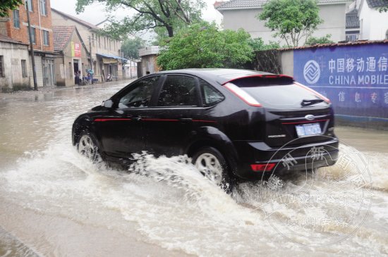由于连日下雨,嵊松线鹿山街道浦桥村路段积水严重,估计积水深度在40厘米以上,成为一片“泽国”。来往车辆不得不靠边缓行,但纵然如此,还是溅起1米左右的浪花。连降大雨,提醒市民出行注意安全。图为一辆汽车开过时的情景。