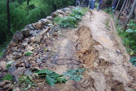 在巡查中,工作人员发现济渡村白洋自然村有一处道路已经形成小型塌方,道路下方有3户人家6间房屋。据工作人员观察,已经有房屋的瓦片被跌落的石块砸碎。