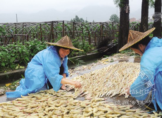 近日,石璜镇姜农正在抓紧时机采售生姜,生姜目前批发价格为每公斤16元。据悉,石璜是我市主要的生姜种植基地,该镇的生姜种植集中在楼家村、朱村和沈村一带,共有面积1000亩左右。图为楼家村姜农在雨天整理生姜。