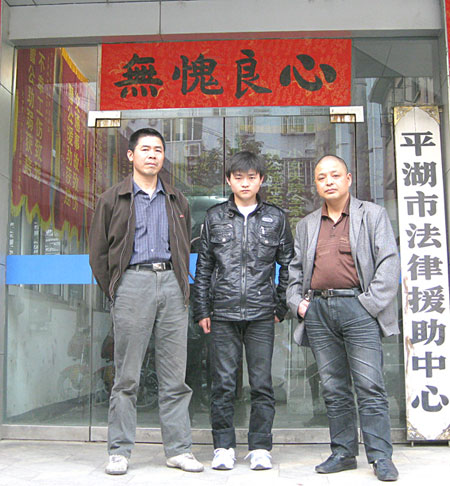 这是周强(中)和父亲(右)及周宏伟的父亲在平湖市法律援助中心门口前的合影。他们告诉记者,在司法局干部曹荣霖等好心人的大声疾呼下,终于使他们得到了国家赔偿及救助。