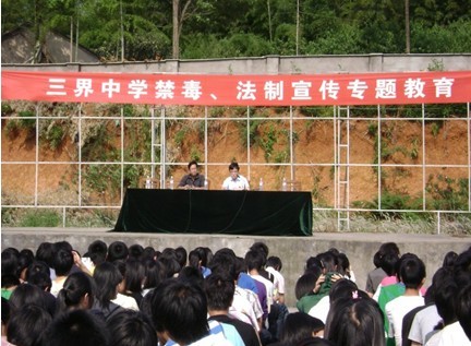 6月2日下午,为进一步贯彻落实上级有关文件精神,加强中学生的守法意识和有效地预防青少年违法犯罪行为的发生,应三界中学和镇综治办、司法所的邀请,市人民法院刑事审判庭、禁毒大队、三界镇政府等单位的多位领导莅临三界中学对禁毒宣传和法制教育专题活动进行具体的指导。