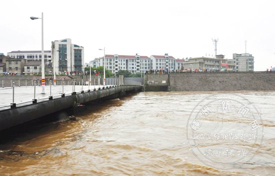 由于连日大雨,昨日中午,西桥处水面离桥面仅有1米左右。为确保人民群众生命财产安全,我市有关部门及时拆除西桥栏杆,封闭西桥地段交通,并关闭了防洪城门。