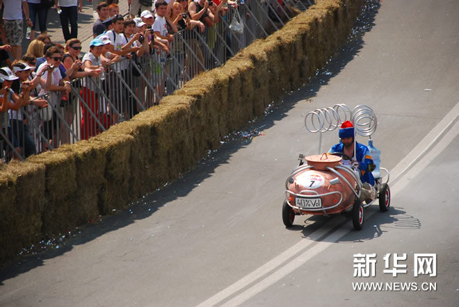 6月18日,在乌克兰首都基辅,参与者驾驶自制汽车参加比赛。当天,基辅举行自制汽车比赛,各种形状奇特的自制赛车吸引了大批观众。新华社发(拉什库尔摄)