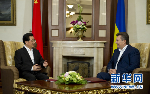 6月18日晚,国家主席胡锦涛在雅尔塔会见乌克兰总统亚努科维奇。新华社记者李学仁摄