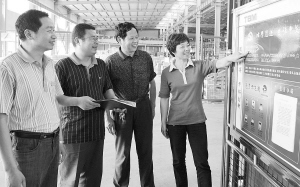 嵊州市黄泽镇的浙江双鸟集团,借中国共产党成立90周年之际,在企业内部以党小组为单位,分别在各车间设立党员“比学赶创”示范牌,激起了该企业在“十二五”开局之年比学赶创的全新气象。图为该企业员工正在观看车间党员的承诺书。【来源:天天商报】