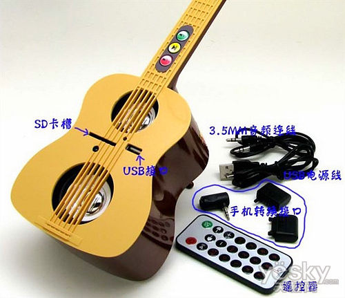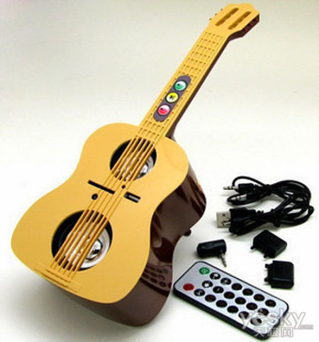 如图所示的吉他音箱,功能齐全,一些常用的借口不经意地穿插设计在音箱吉他造型的箱体上,充满趣味。附带的一些音频线、电源线,插口等一应俱全。