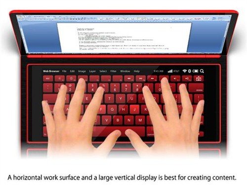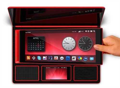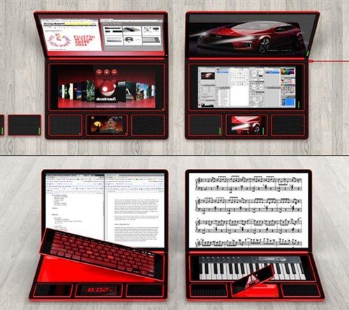 在这款概念笔记本上用户可以将下部的的长条部件作为平板电脑使用,下面还有一个手机,一个太阳能充电器以及固态存储设备。这款笔记本最大的特点就是将人们日常需要的电子产品集中在这同一款设备上。