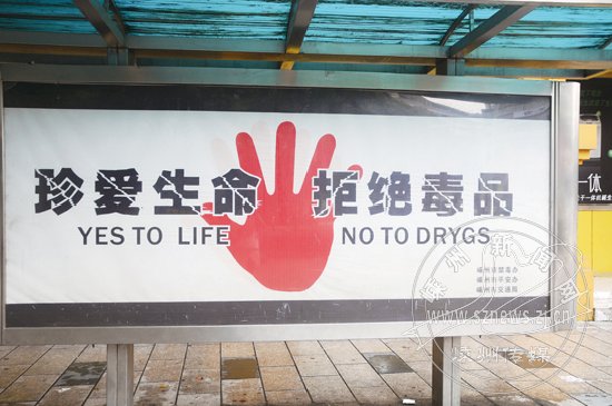 昨天上午,记者根据Kenny的描述,来到了这个公交车站,看到这个广告的主题是“珍爱生命、远离毒品”,在八个大字下方还有一串英文翻译:“YES TO LIFE,NO TO DRYGS。”Kenny说,“不考虑语法,‘毒品’这个单词肯定错掉了,应该是drugs。”