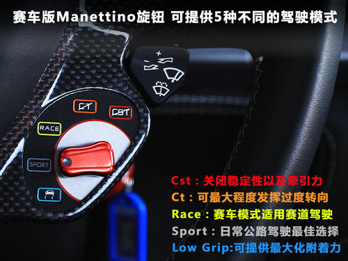 请相信我下面所提及的一点重要提示,在你未摸清458 italia秉性前,请勿使用Launch超级起步模式,因为强大的推动力会使车身后部强烈摆动,而这一扭拽力我敢保证是你从未感受过的,随之而来的则是无用的方向指向,除非你是已拥有赛车执照的专业人员,否则你将难以控制住这头猛兽的何去何从。