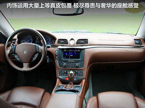 玛莎拉蒂GranTurismo S跑车自动挡的车厢设计不算很大胆,方正的中控台上各种功能分区而设,比较一目了然。一些细节不乏精彩造型,但整体气氛比较稳重,配合宽大的空间,适合长时间置身其中。此外玛莎拉蒂还提供10种皮革颜色、13种缝线颜色、5种地毯颜色、3种木材等搭配,车主几乎对车厢内任何一寸细小部位都有选择权。
