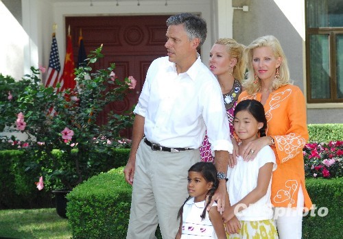 2009年8月22日,美国新任驻华大使Jon Huntsman(中文名:洪博培)在北京美国大使馆新闻处举行到任媒体会。洪博培发表了履新感言并介绍了自己的家人。图中前排为洪博培在印度收养的女儿阿莎、中排左一为洪博培、左二为在中国扬州收养的女儿杨乐意、后排左一为大女儿玛丽安、左二为妻子玛丽。中新社发 侯宇