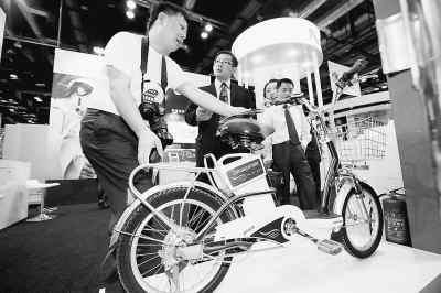 中日绿色博览会日前在北京中国国家会议中心举行。图为观众在博览会上了解新款电动自行车。陈晓根摄