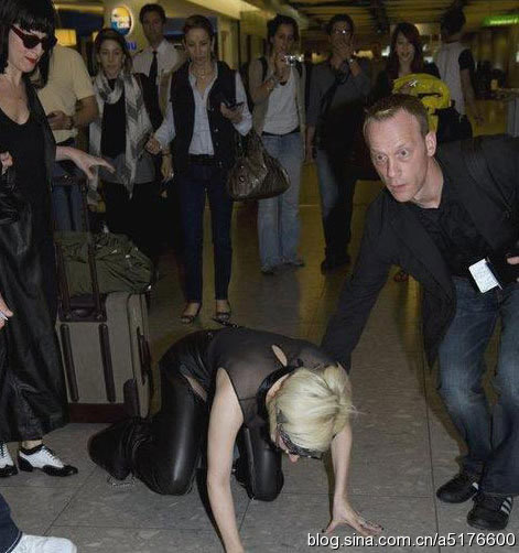 去年,6月23日Lady Gaga抵达伦敦机场。短发头巾造型的Lady Gaga上身穿着透视装,露出了黑色胸衣,下身穿着带有披风的黑色皮裤,贴身是一条黑色网袜,脚踩个性蹄形鞋,起初还一脸傲气的Gaga姐却一不小心“失前蹄”,跌倒在众人面前。