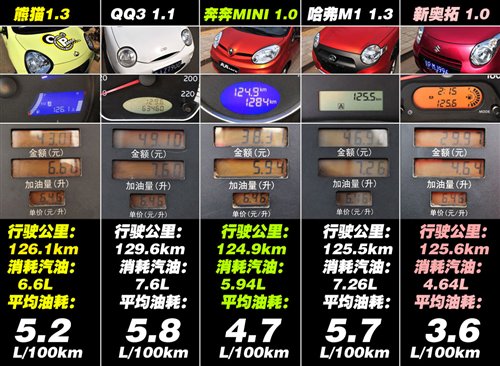 在我们对5款主流微型车进行的油耗对比测试中,奥拓以行驶125.6公里仅消耗4.64L 93#汽油的表现拔得头筹,平均油耗仅为3.6L/100km(对比测试路况为中午的四环路,行驶比较通畅,基本处于60-80km/h巡航状态)。和它表现最接近的奔奔MINI也仅有4.7L/100km的成绩,比奥拓高出了1.1L。