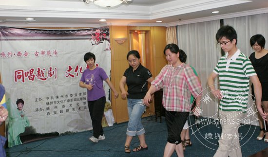 “同唱越剧文化走亲”是市委宣传部、市文广新局为交流、探讨越剧艺术、弘扬越剧文化、打响越剧品牌推出的一项活动。西安是本次活动的第一站,由市文化馆和西安越剧艺术团组织。西安越剧艺术团成立于1999年,现有团员30多人,都是爱好越剧的退休人员、上班族、学生,因弘扬越剧、传承越剧、学习越剧、享受越剧艺术而走在一起。图为市文化馆的裘珍媛老师(右二)正在向西安越剧戏迷传授越剧表演艺术。