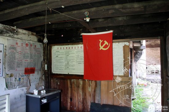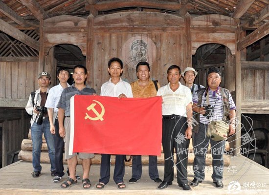 走出刘老的家,在刘其洪书记的陪同下,我们又来到“三五支队”当年住过的房子,如今已然倒塌,在残留的砖石里仍有当年的记忆,走进“三五支队”开会的祠堂,一位网友拿来了一面党旗,大家神色凝重地在祠堂台上合影留念。