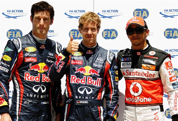 6月25日,2011赛季F1欧洲站排位赛在西班牙瓦伦西亚赛道结束。经过三节比拼,红牛车队包揽了发车头排。维特尔获得第一,队友韦伯排名第二。迈凯轮车队的汉密尔顿力压法拉利双雄位居第三。看来,本站比赛国际汽联对于引擎设置的限制规则,未能改变红牛的垄断地位。