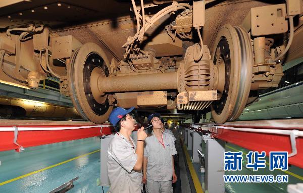 6月17日,中国北车唐车公司驻上海动车所售后服务站工作人员在检查入库车辆。