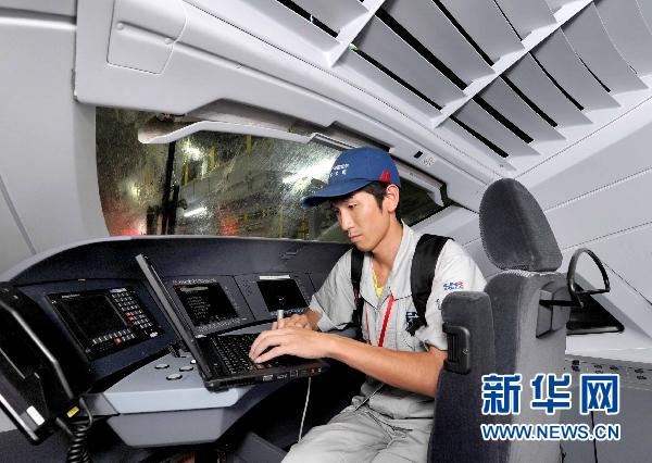 6月17日,中国北车唐车公司驻上海动车所售后服务站工作人员对动车组当日运行数据进行核查。