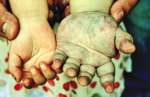 三岁的小明,聪明听话。据小明的父亲说,女儿刚出生时,医生就发现了这个问题,左手的皮肤明显没有弹性,还浮肿,摸上去的感觉如同棉花一样,比健康的手大一倍以上,手感也有明显的区别。