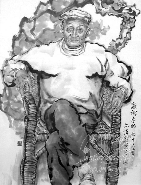 商敬诚先生德高望重、桃李满天下,所培养的学生有画花鸟的、有画山水的,也有画人物的。参展作品中,绝大多数师承了商先生的写意花鸟画技法,但也有几位弟子画人物的,其中有几张是画商老师的,这里刊出的是大弟子张亦浩画的《老当益壮》,及稍晚的弟子陈蔚南前几年画的《良师》两幅。前者画的是商先生近照,背景为老树茂叶,衬托出老而弥坚的艺术意趣;后者画的是壮年时的商老师,目光深邃、神情自若,水墨淋漓地画出了一个大艺术家的风范。