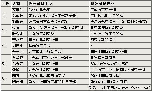 随着2011年年中将至,各大汽车车企的上半年销量成绩即将出炉,整体来看销量一直在呈现下滑趋势,这使得上半年的高层人事变动也变得密集起来。已经有包含东南、上汽、斯柯达、北汽、丰田、路虎等众多企业的高层发生人事变动,这其中有人欢喜有人忧,因为业绩出色而被升职值得开心,而黯然下课的相信也会心中不服,或许不久就会出现在新战场上迎接挑战。