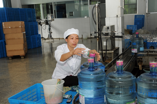 气温升高,矿泉水又到销售高峰期。位于北漳镇的嵊州石源麦饭石矿泉水有限公司,这段时间的生产和销售量比平时增加了30%左右,生产的矿泉水主要销往宁波和日本。图为该公司桶装矿泉水灌装车间。