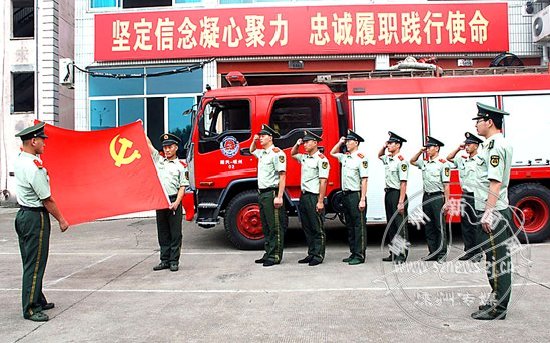 “我志愿加入中国共产党,拥护党的纲领,遵守党的章程……”昨日上午,在红色消防战车前,市消防大队组织党员面对党旗庄严宣誓,并组织入党积极分子认真学习党章,升国旗,唱国歌,迎接建党90周年。