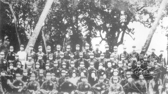 1949年5月19日,嵊新县大队解放崇仁镇。这是崇仁区党政军人员在清泉坟堋合影,后排右一为当时年仅14岁的金樟寅