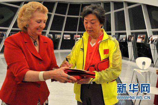 7月1日,中国乒乓球老将杨俊(右)为前来参加庆祝活动的美国人签名留念。当日,美国威斯康星州密尔沃基市艺术博物馆举办中美“乒乓外交”40周年庆祝活动,来自中国乒乓球协会的11名新老乒乓球运动员与美国新老乒乓球运动员进行了现场表演。新华社发(蒋新彤摄)