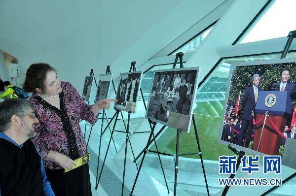 7月1日,两名美国人观看中国“乒乓外交”图片展。当日,美国威斯康星州密尔沃基市艺术博物馆举办中美“乒乓外交”40周年庆祝活动,来自中国乒乓球协会的11名新老乒乓球运动员与美国新老乒乓球运动员进行了现场表演。新华社发(蒋新彤摄)