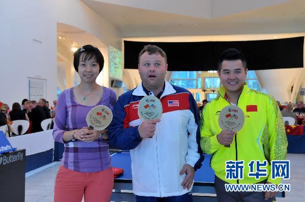7月1日,世界冠军张怡宁(左)、刘国正(右)与美国乒乓球运动员合影留念。当日,美国威斯康星州密尔沃基市艺术博物馆举办中美“乒乓外交”40周年庆祝活动,来自中国乒乓球协会的11名新老乒乓球运动员与美国新老乒乓球运动员进行了现场表演。新华社发(蒋新彤摄)