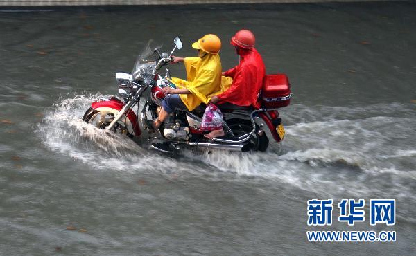 7月3日,两名市民在成都市武侯区长寿南路的积水路段骑车前行。 当日,四川省成都市遭暴雨袭击,多处路段积水严重,给市民出行带来不便。据四川省气象台发布的信息,成都市3日傍晚到4日晚间仍有明显的降雨天气过程。 新华社发(薛玉斌 摄)