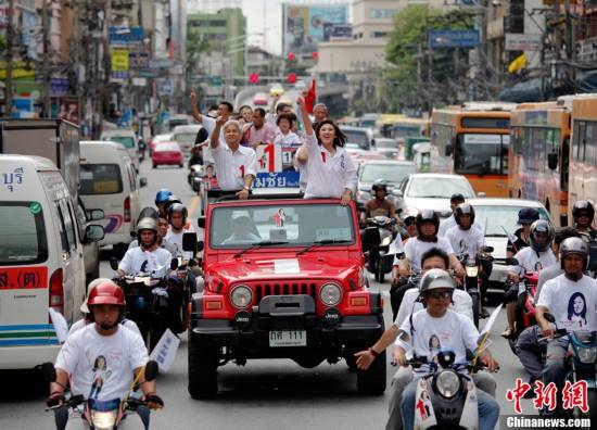 泰国7月3日迎来自1932年施行君主立宪制以来的第26次国会下议院选举。这是2009年“红衫军”闹事引发大规模流血事件后的首次政党之争。选举主要在为泰党和民主党之间展开,外界普遍认为,新一任总理将在为泰党头号议员候选人英禄和民主党党首阿披实之间产生,英禄是前总理他信的妹妹。图为7月2日,英禄在曼谷乘车向支持者挥手致意。
