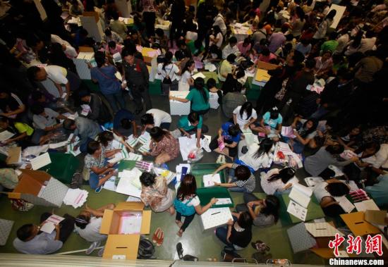 泰国7月3日迎来自1932年施行君主立宪制以来的第26次国会下议院选举。这是2009年“红衫军”闹事引发大规模流血事件后的首次政党之争。选举主要在为泰党和民主党之间展开,外界普遍认为,新一任总理将在为泰党头号议员候选人英禄和民主党党首阿披实之间产生,英禄是前总理他信的妹妹。图为泰国行政工作人员在为投票做最后准备。