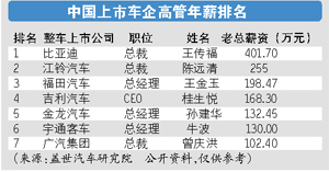 进入6月底,多家跨国汽车企业“一把手”的最新收入统计相继公布。中外车企CEO谁是打工皇帝?比亚迪公司CEO王传福代表了国内上市车企老总薪水最高水平——401.7万元(约合59.1万美元),而福特CEO穆拉利则是国际汽车巨头老总收入的顶尖水平——2010年收入达2650万美元。