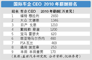得益于2010年全球经济加快复苏,多数汽车市场出现反弹势头,不少企业盈利甚至创出新高,高管的收入随之水涨船高。欧美车企高管收入处于遥遥领先的地方,日系车企2010年遭受挫折,高管薪酬与欧美车企相距甚远。