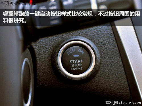 睿翼轿跑的一键启动按钮样式比较常规,不过按钮周围的用料很讲究,仿人体皮肤的材质摸上去手感十足,而且在常规位置上依然配有钥匙孔,出现意外情况时可以将钥匙拔下插入锁,细节部分还是很到位。