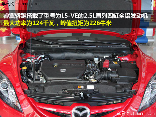 睿翼轿跑搭载了型号为L5-VE的2.5L直列四缸全铝发动机,最大功率为124千瓦,峰值扭矩为226牛米,采用了S-VT(可变气门正时)、VIS(可变气门升程)以及TSCV(可变进气涡流控制)系统。
