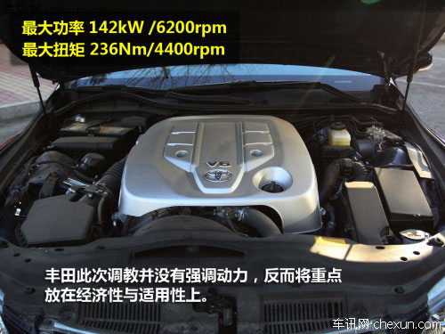 锐志依然搭载了和老款相同的型号为5GR-FE的2.5L V6发动机,只是动力参数上经过调校后比老款略低,具有双可变气门正时(Dual VVT-i)技术,最大功率为142千瓦,峰值扭矩为236牛米。