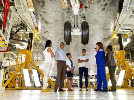 总统奥巴马、第一夫人米歇尔、他们的女儿玛丽亚(左)和萨沙以及米歇尔的母亲玛丽亚·罗宾森,站在“亚特兰蒂斯”号航天飞机起落装置下面。照片于2011年4月29日在佛罗里达州卡纳维拉尔角的肯尼迪航天中心拍摄,总统一家的此次肯尼迪航天中心之旅由宇航员珍妮特·卡万迪和联合航天联盟公司热防护系统项目负责人特里·怀特充当向导